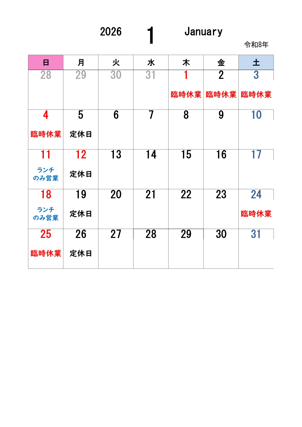 1月5日(日)休業