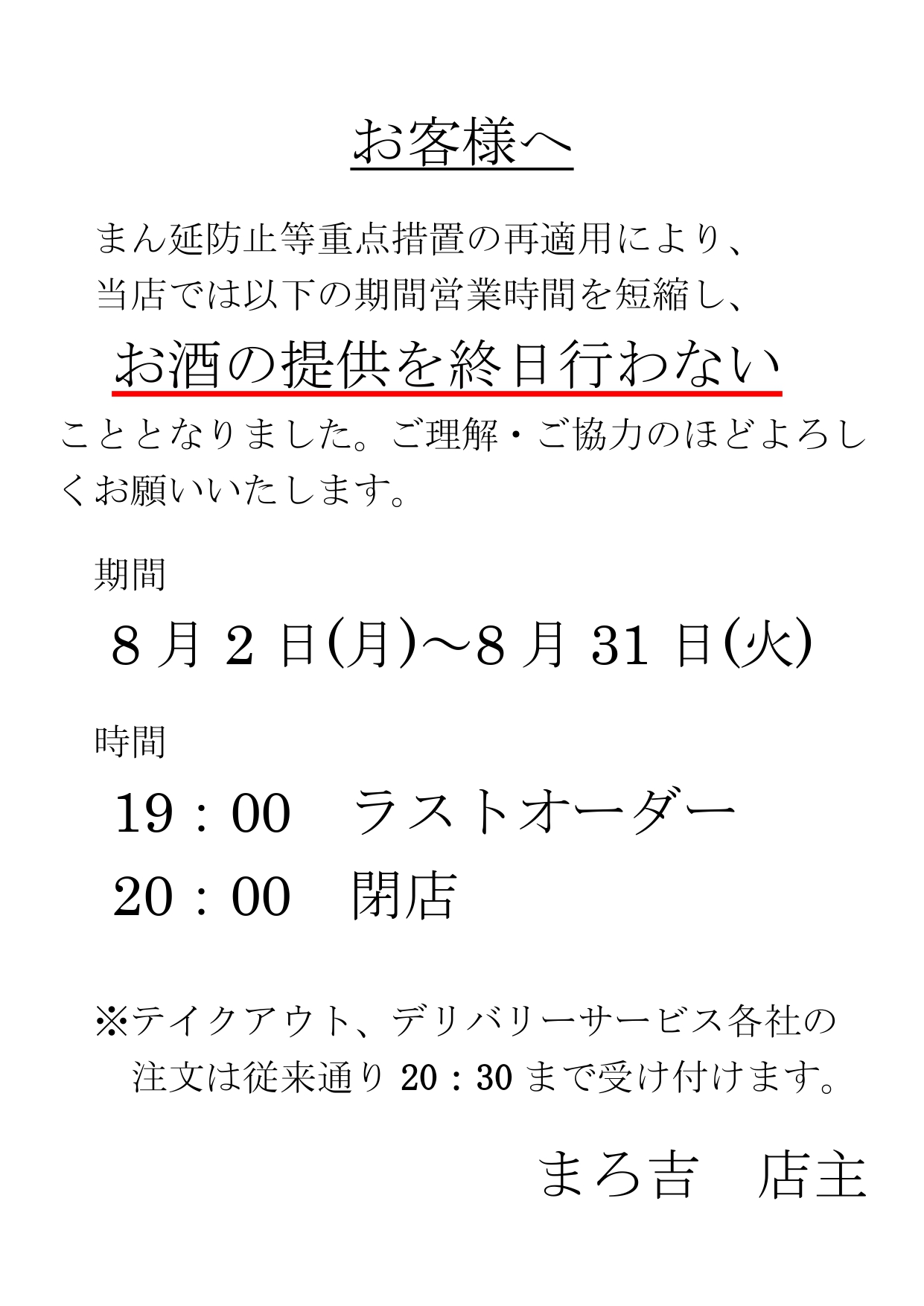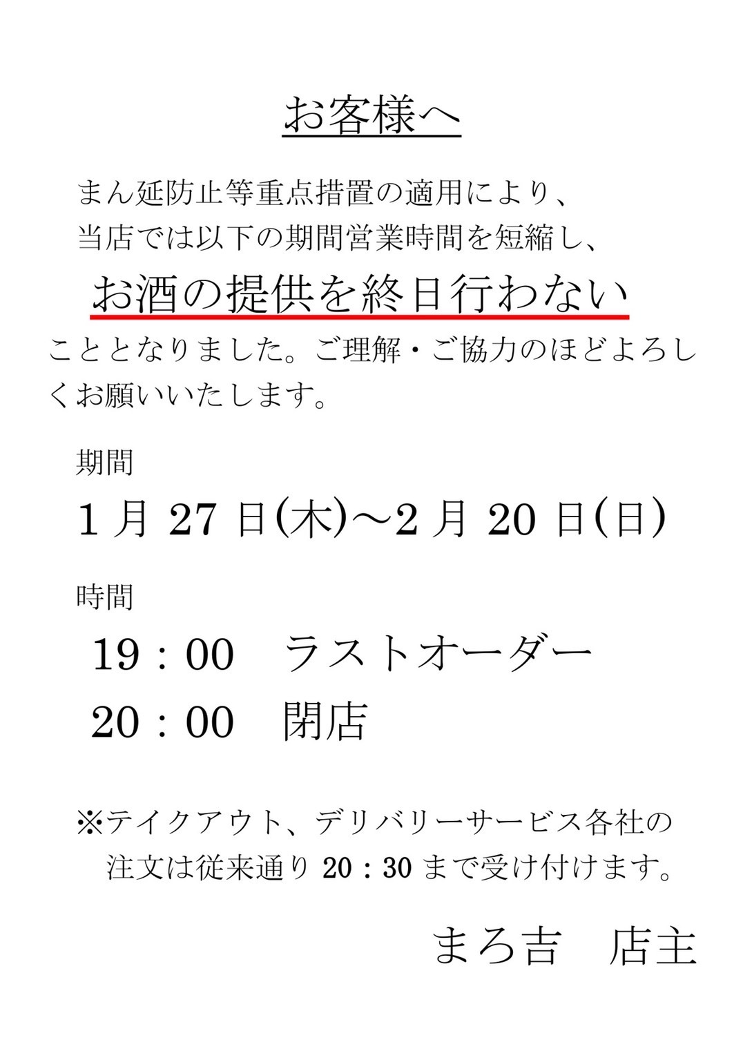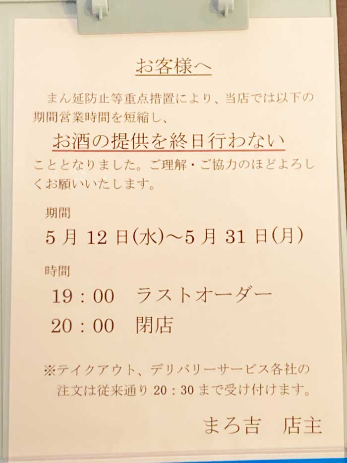いつもまろ吉をご利用いただきありがとうございます。 この度、札幌市の時間短縮要請の強化を受け、当店では営業時間を以下のように変更させていただきます。