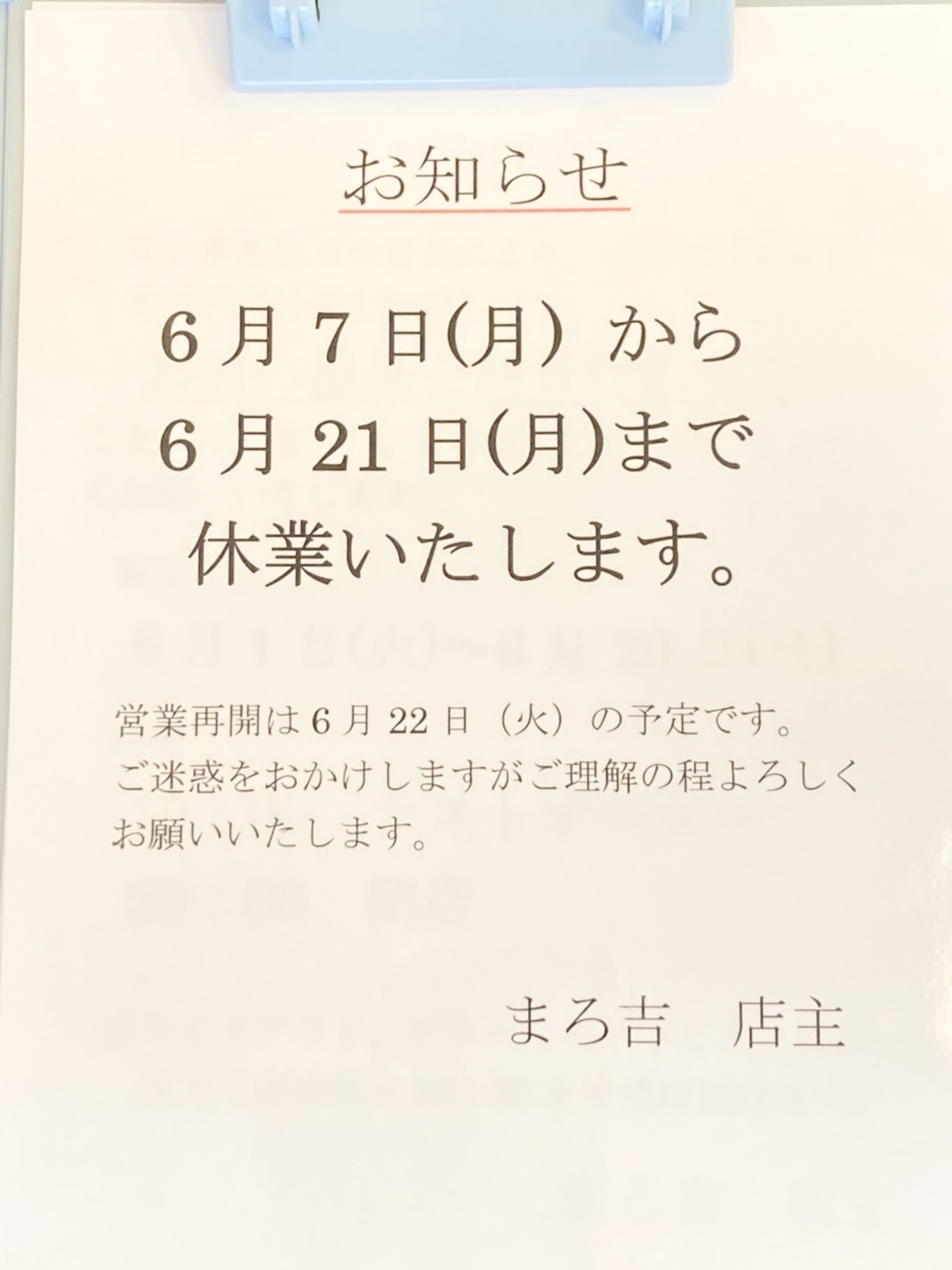 営業再開は6月22日(火)の予定です。ご迷惑をおかけしますがご理解の程よろしくお願いいたします。