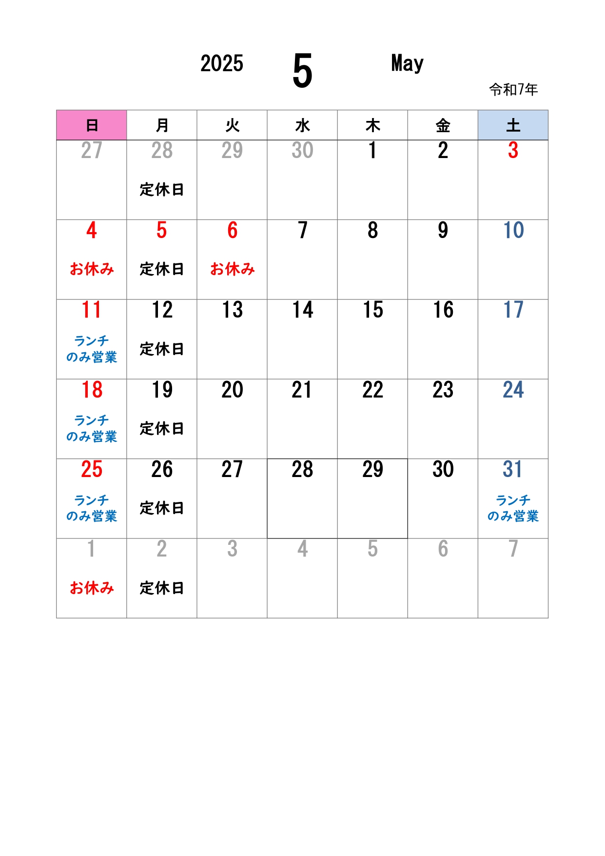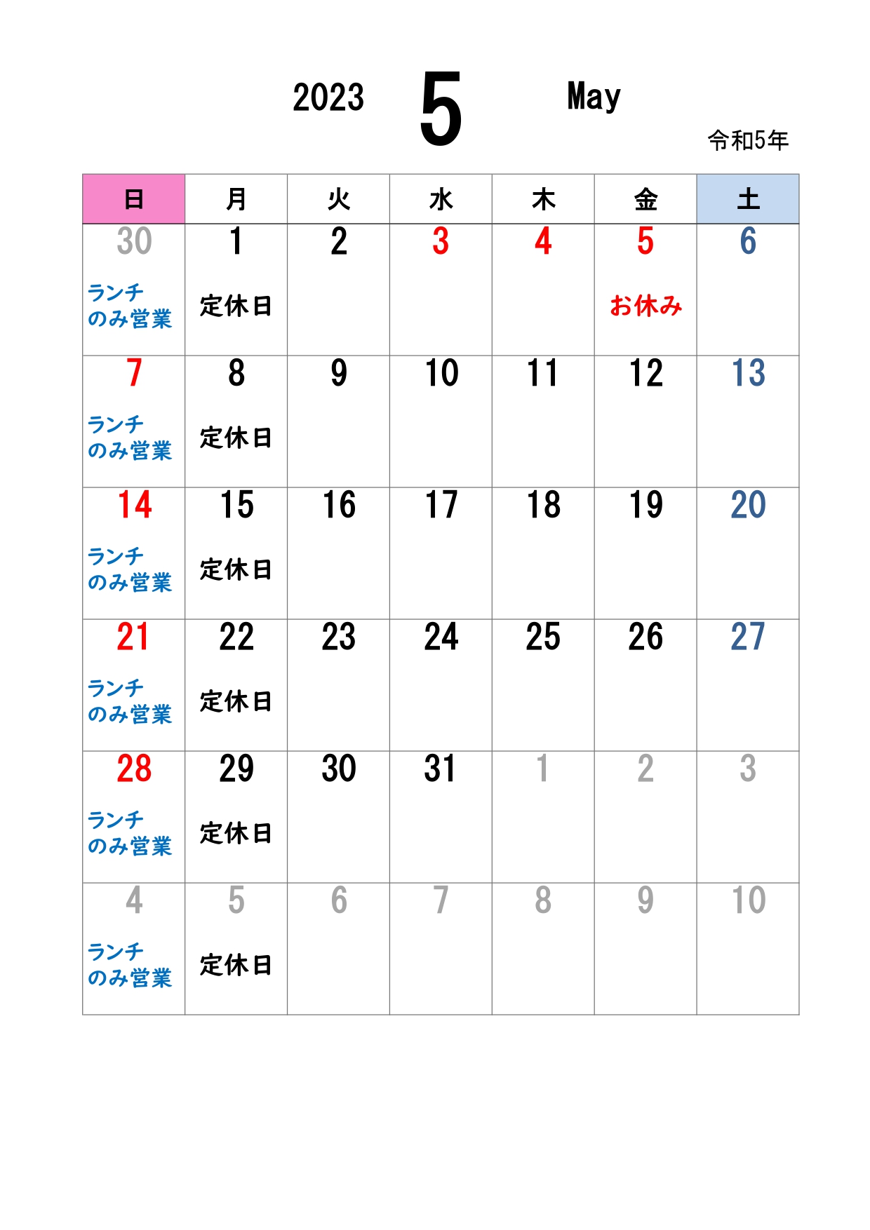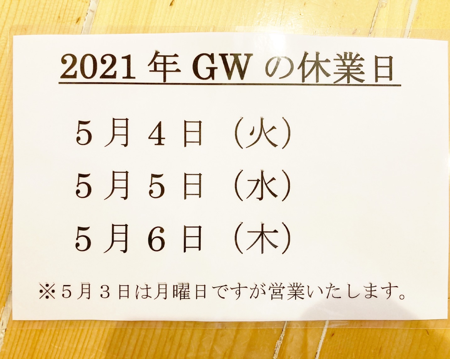 ゴールデンウィークは5月5日(金)を臨時休業とさせていただきます。