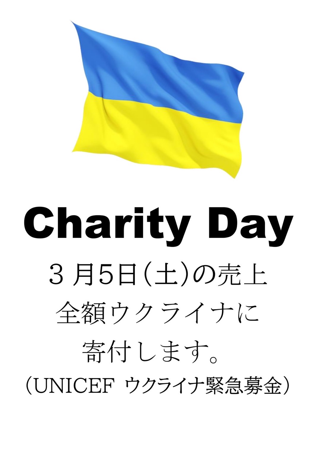 3月5日に行われたチャリティーイベントでは売上の合計が83,780円となりました。 全額UNICEFのウクライナ緊急募金に寄付してまいりました。