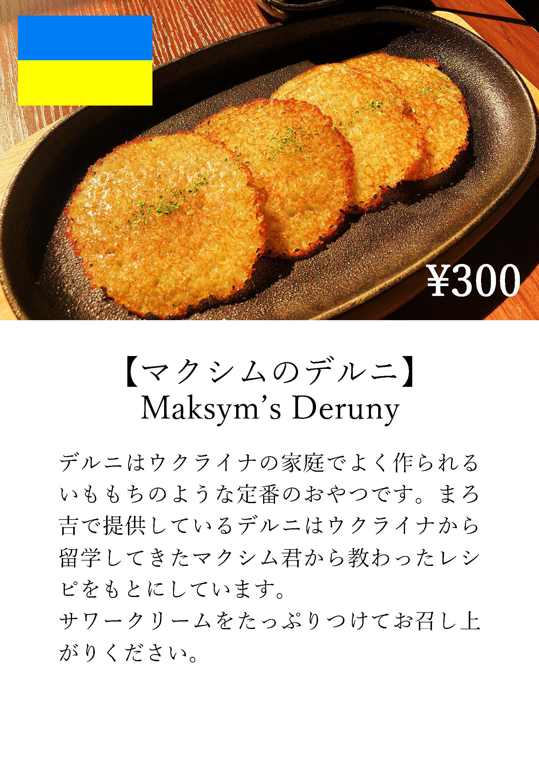 まろ吉で提供しているデルニはウクライナから留学してきたマクシム君から教わったレシピをもとにしています。