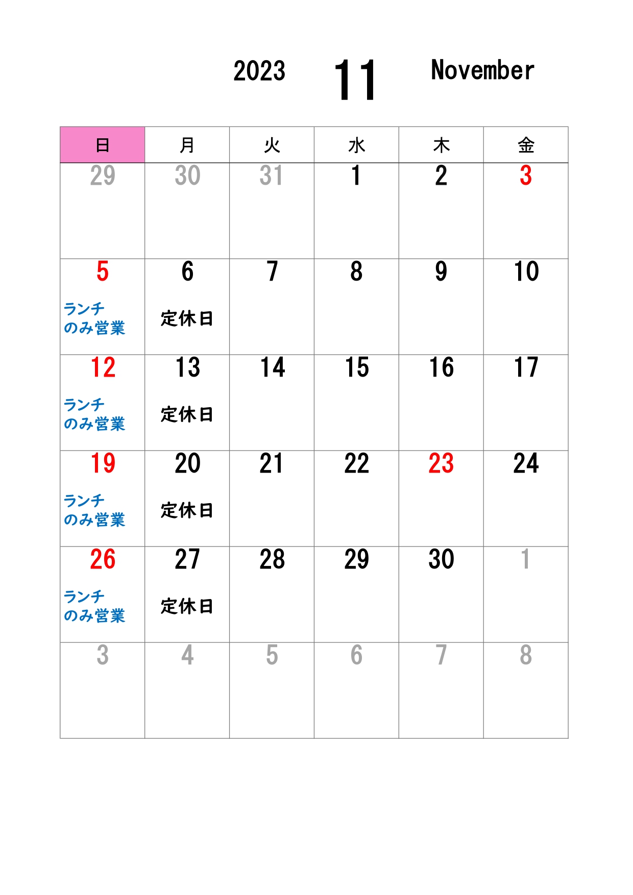 11月の営業日カレンダーです。