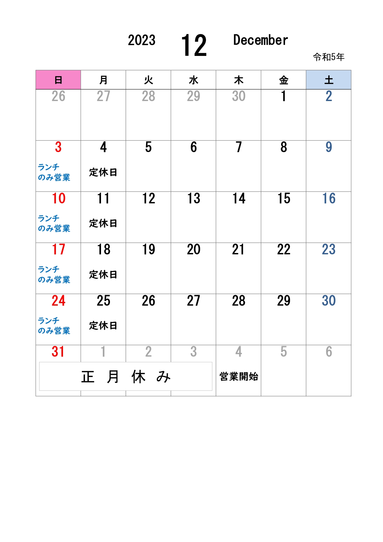 新年は1月5日(火)11:00オープンです。