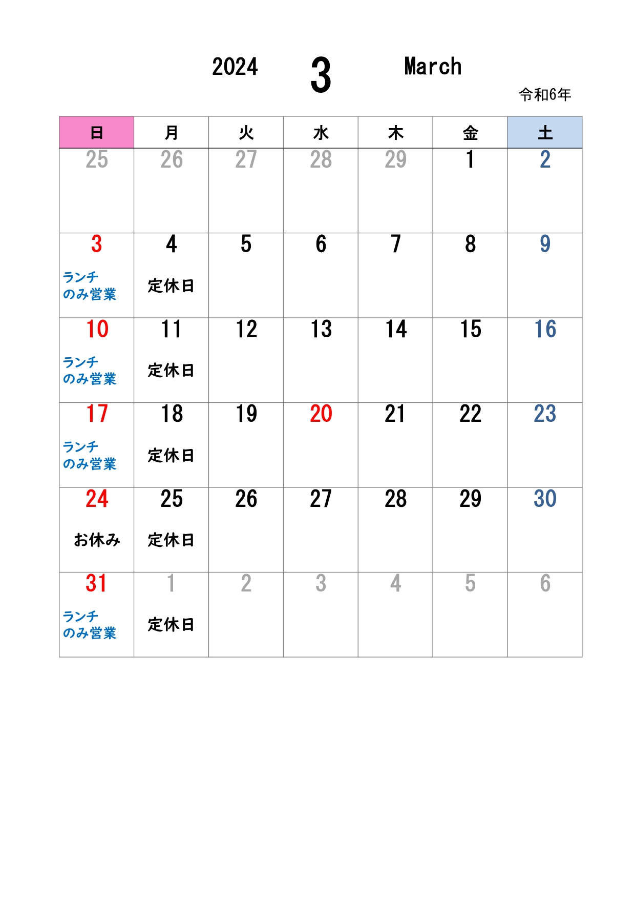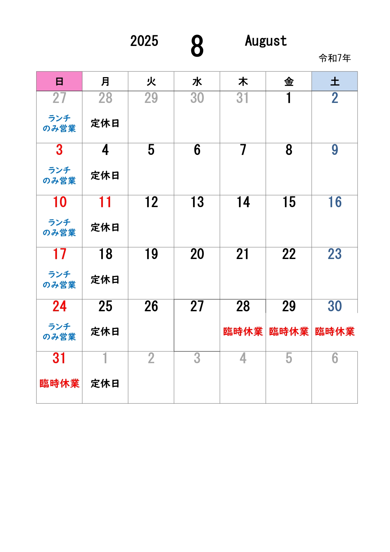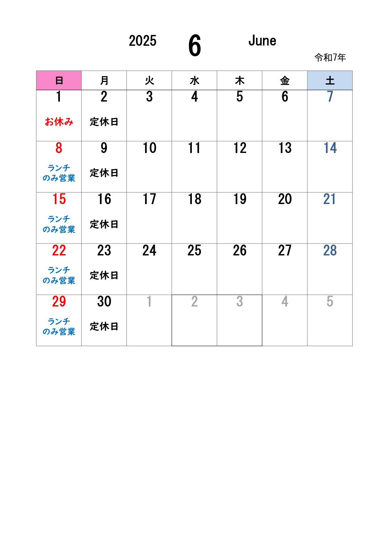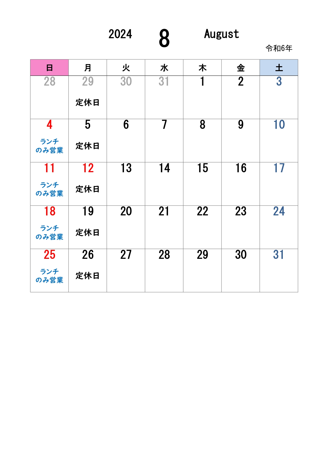 通常通り月曜日定休、日曜日はランチのみ営業です。