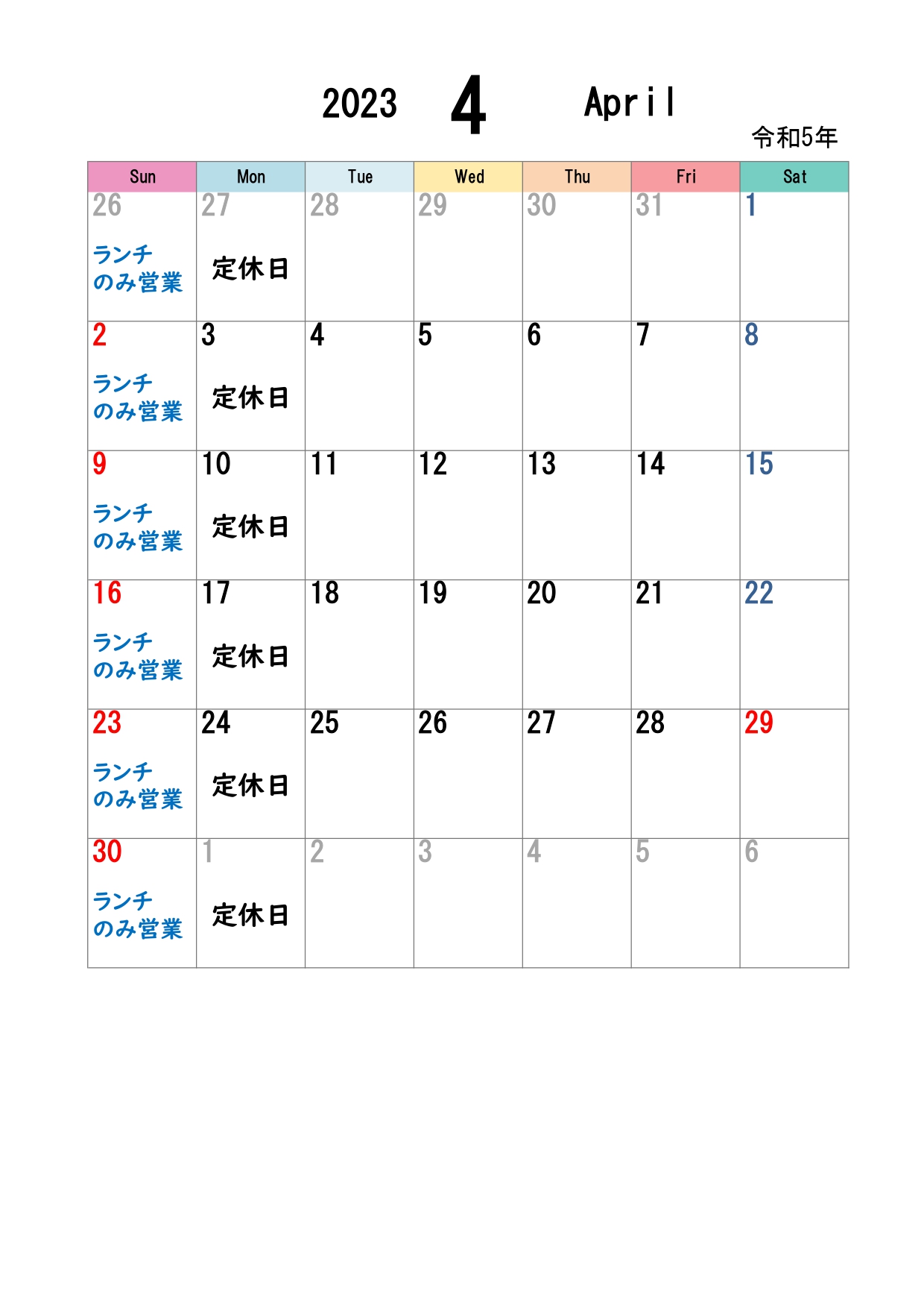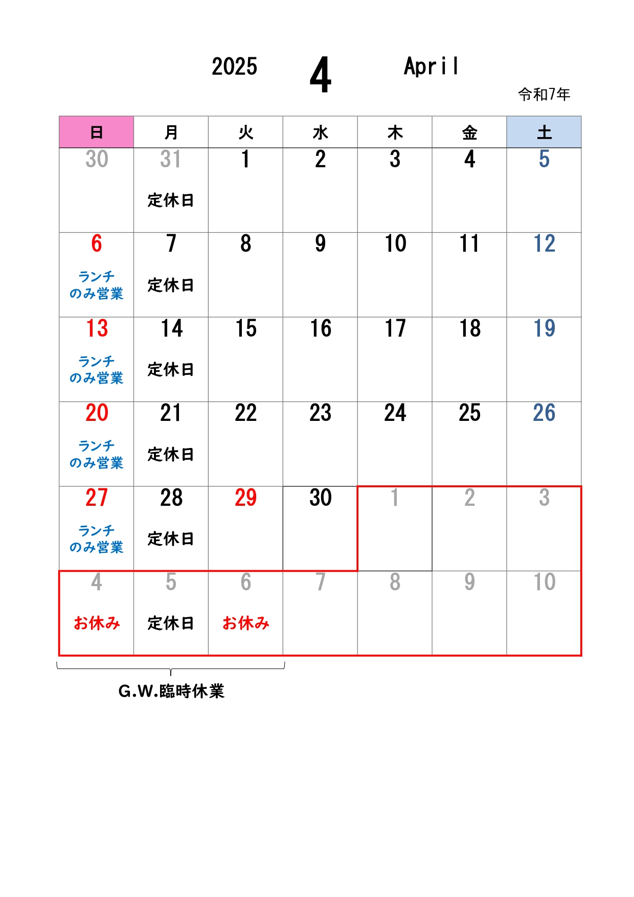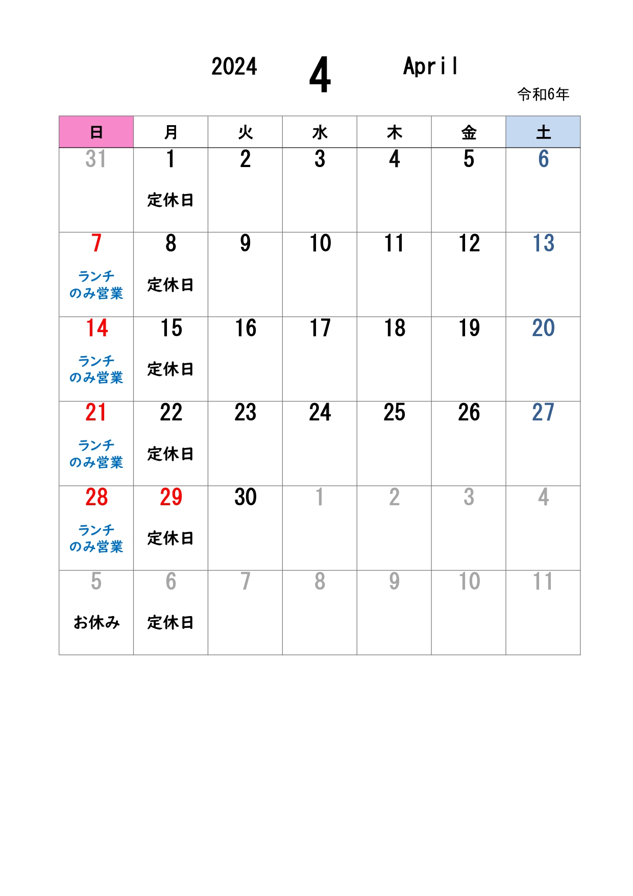 4月の営業日カレンダーです。