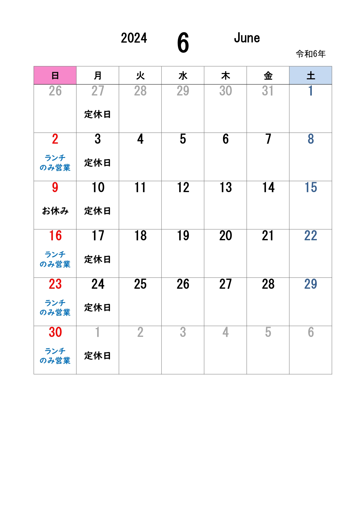 いつもまろ吉をご利用いただきありがとうございます。 6月の営業日カレンダーです。