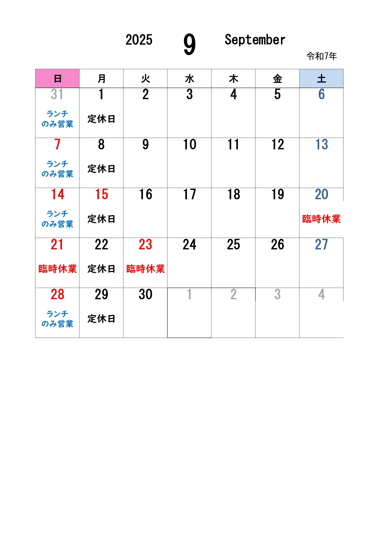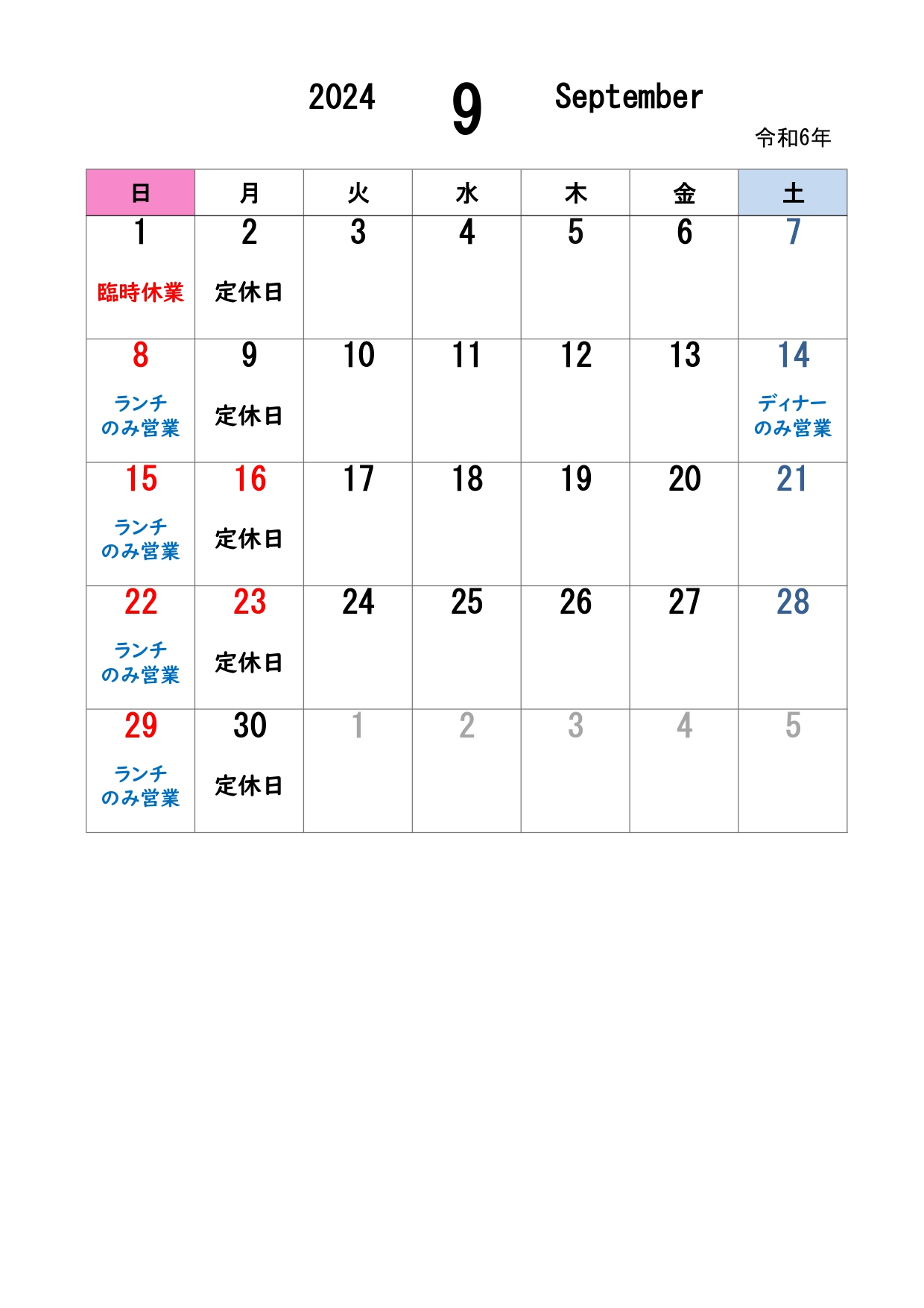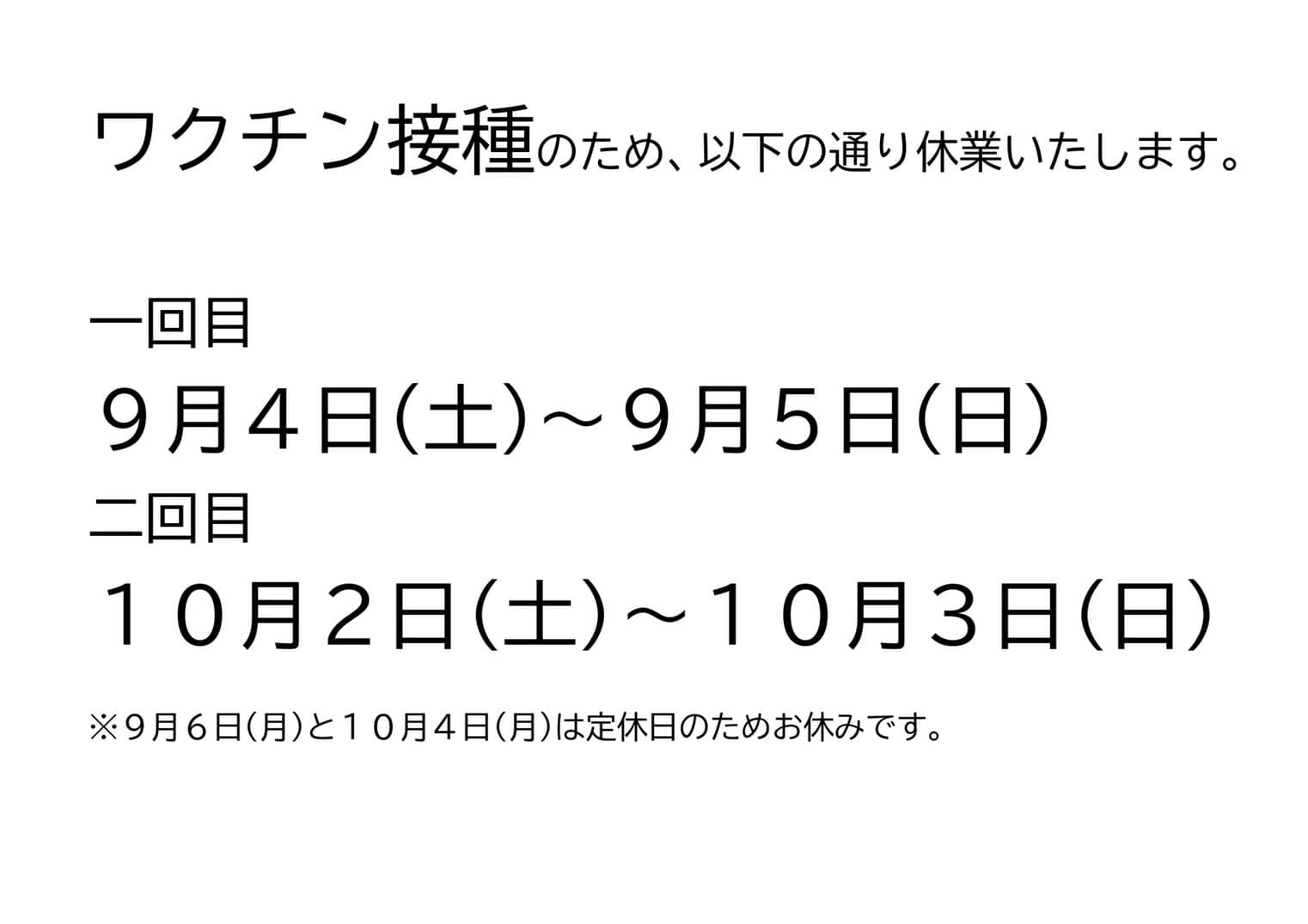 ※9月6日(月)と10月4日(月)は定休日のためお休みです。