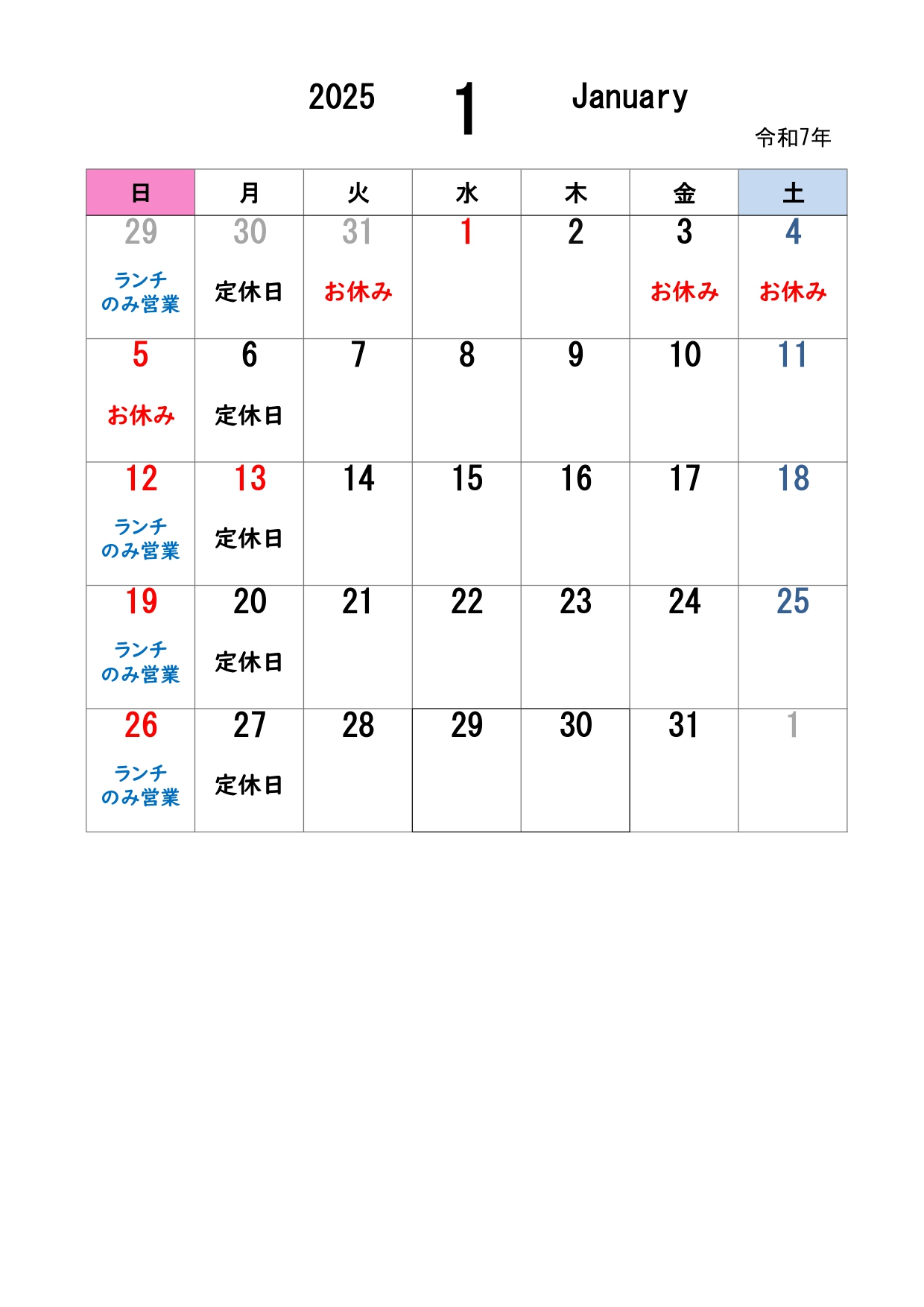 1月5日(日)休業