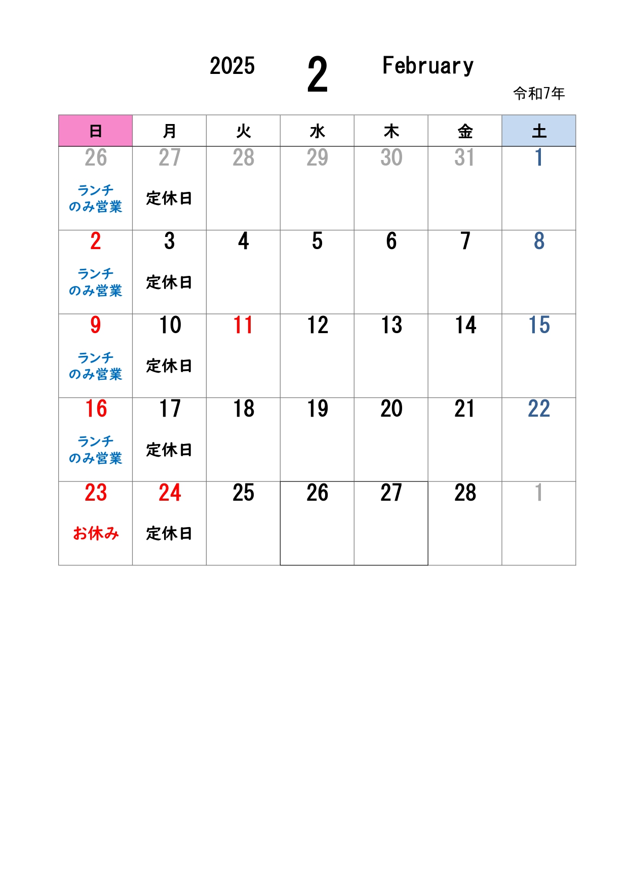 いつもまろ吉をご利用いただきありがとうございます。 2月の営業日カレンダーです。