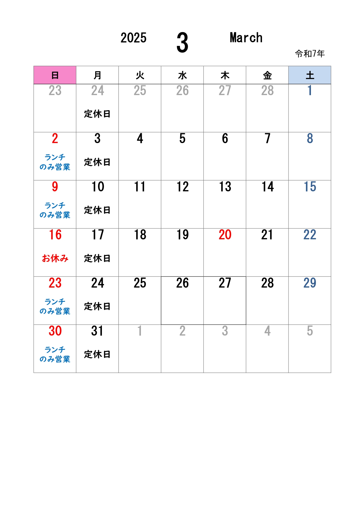 いつもまろ吉をご利用いただきありがとうございます。 3月の営業日カレンダーです。