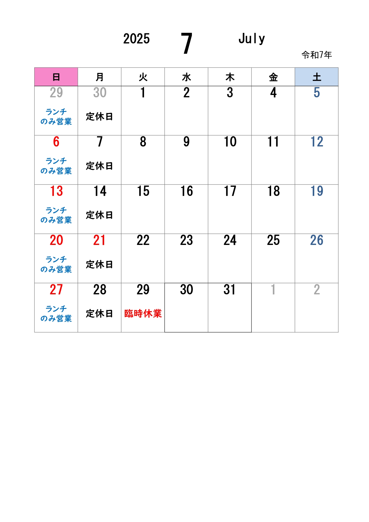 いつもまろ吉をご利用いただきありがとうございます。 7月の営業日カレンダーです。