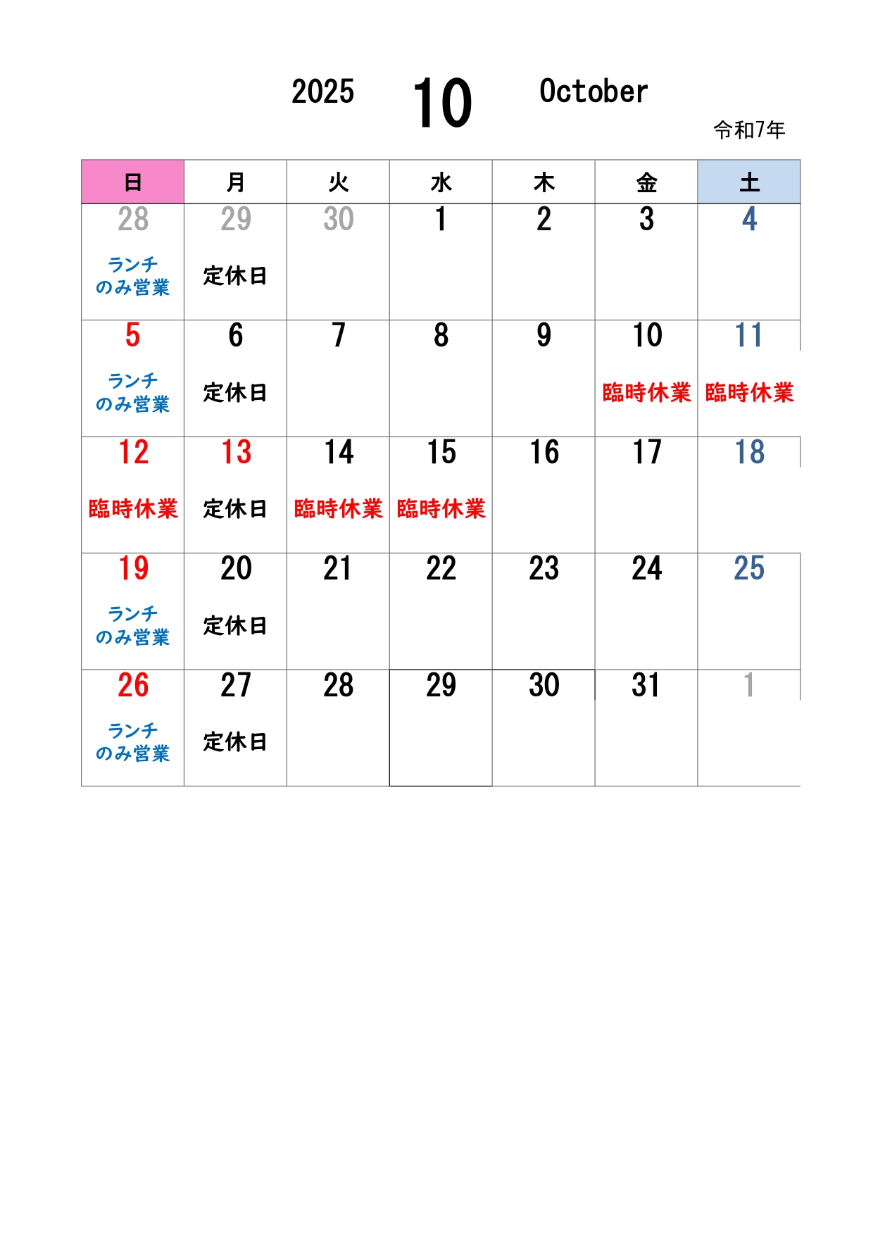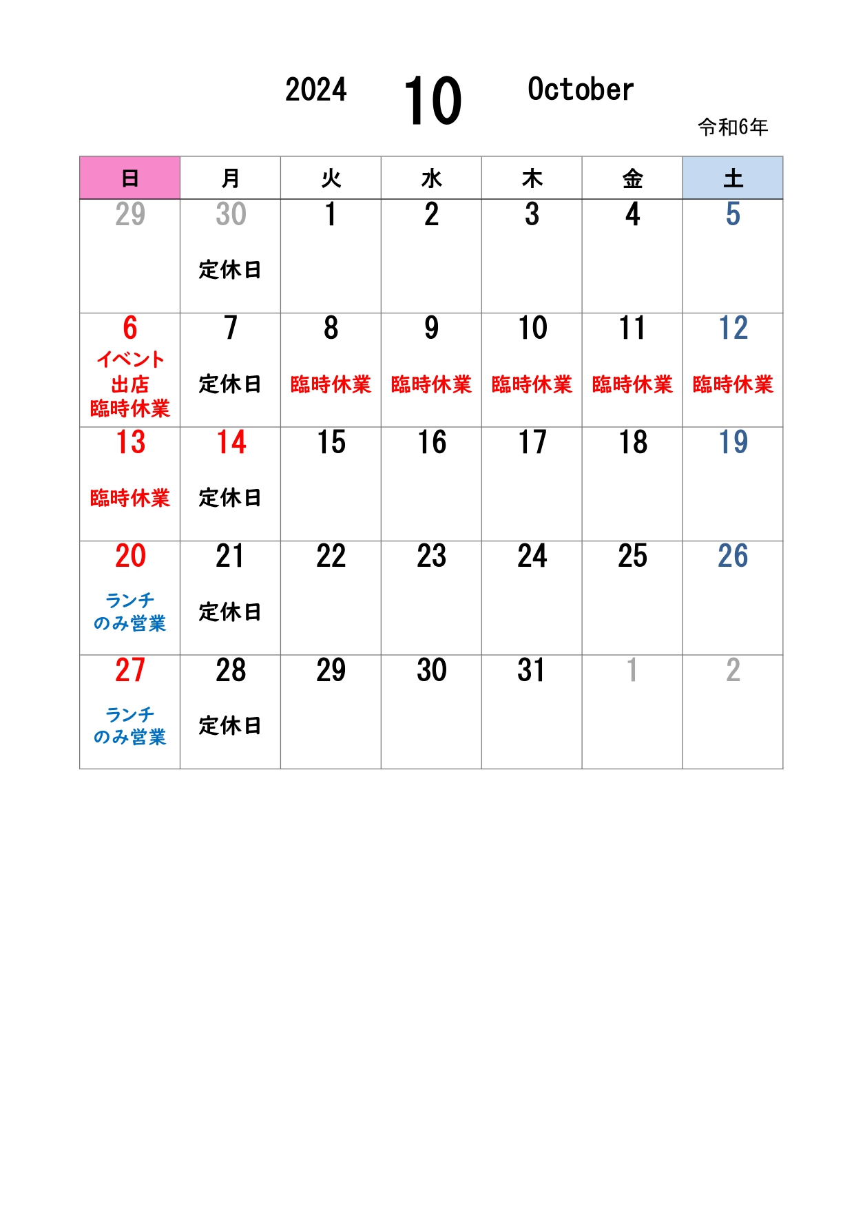 10月の営業日は定休日に加え、臨時休業日もございます。 画像の通りになりますのでご来店・テイクアウト等でのオーダーをお考えのお客様はお手数おかけしますが、ご確認お願いいたします。
