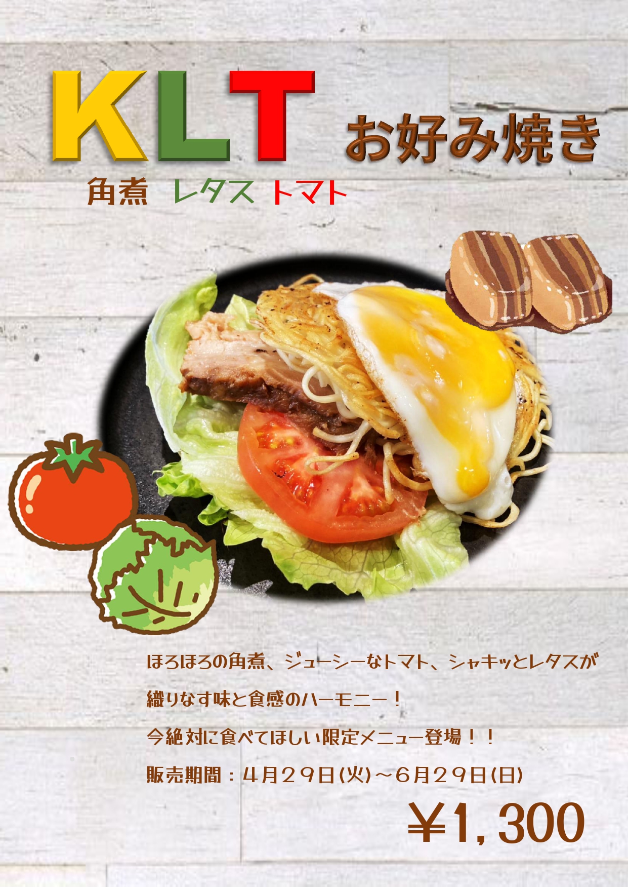 まろ吉から久しぶりの新作です! KLT(角煮レタストマト)お好み焼き新登場!