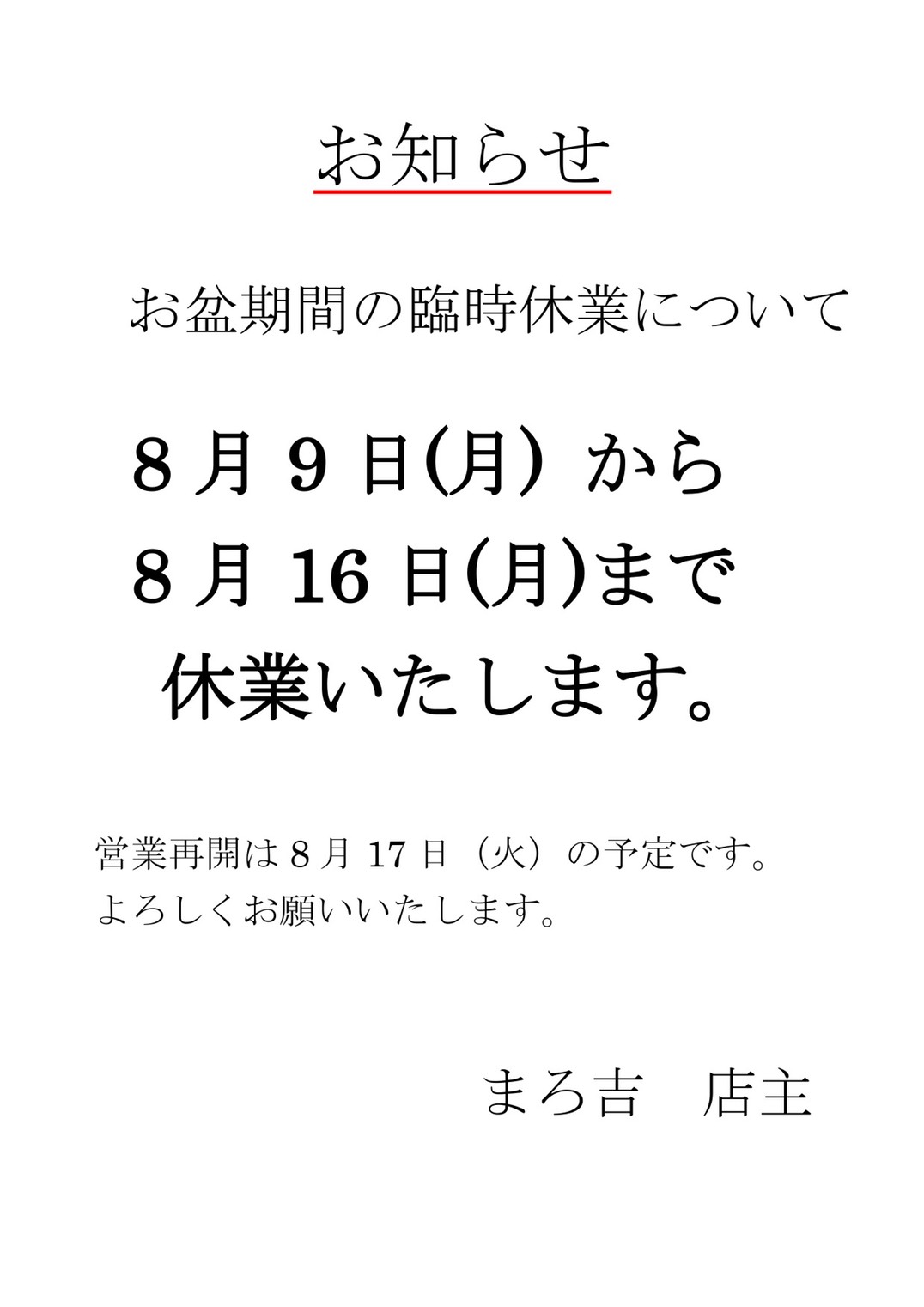 8月9日(月)〜8月16日(月)まで休業いたします。