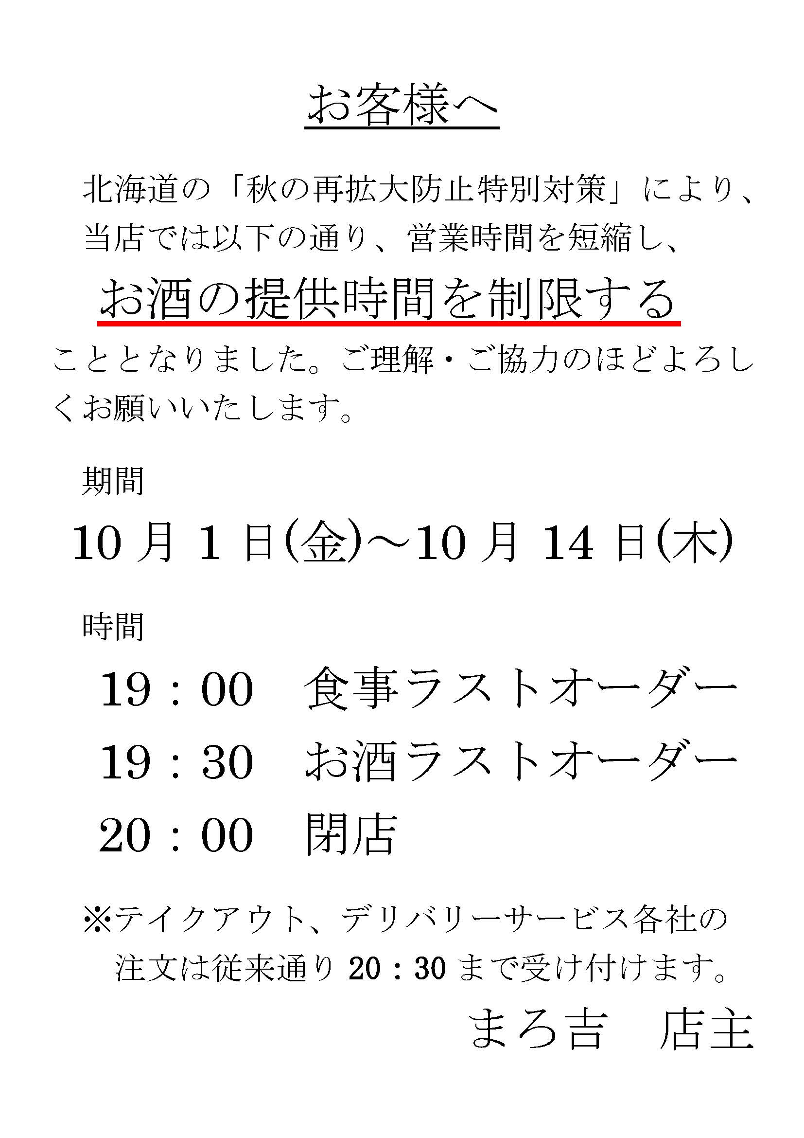 いつもまろ吉をご利用いただきありがとうございます。 北海道の「秋の再拡大防止特別対策」により、当店では以下の通り営業時間を短縮し、お酒の提供時間を制限することとなりました。