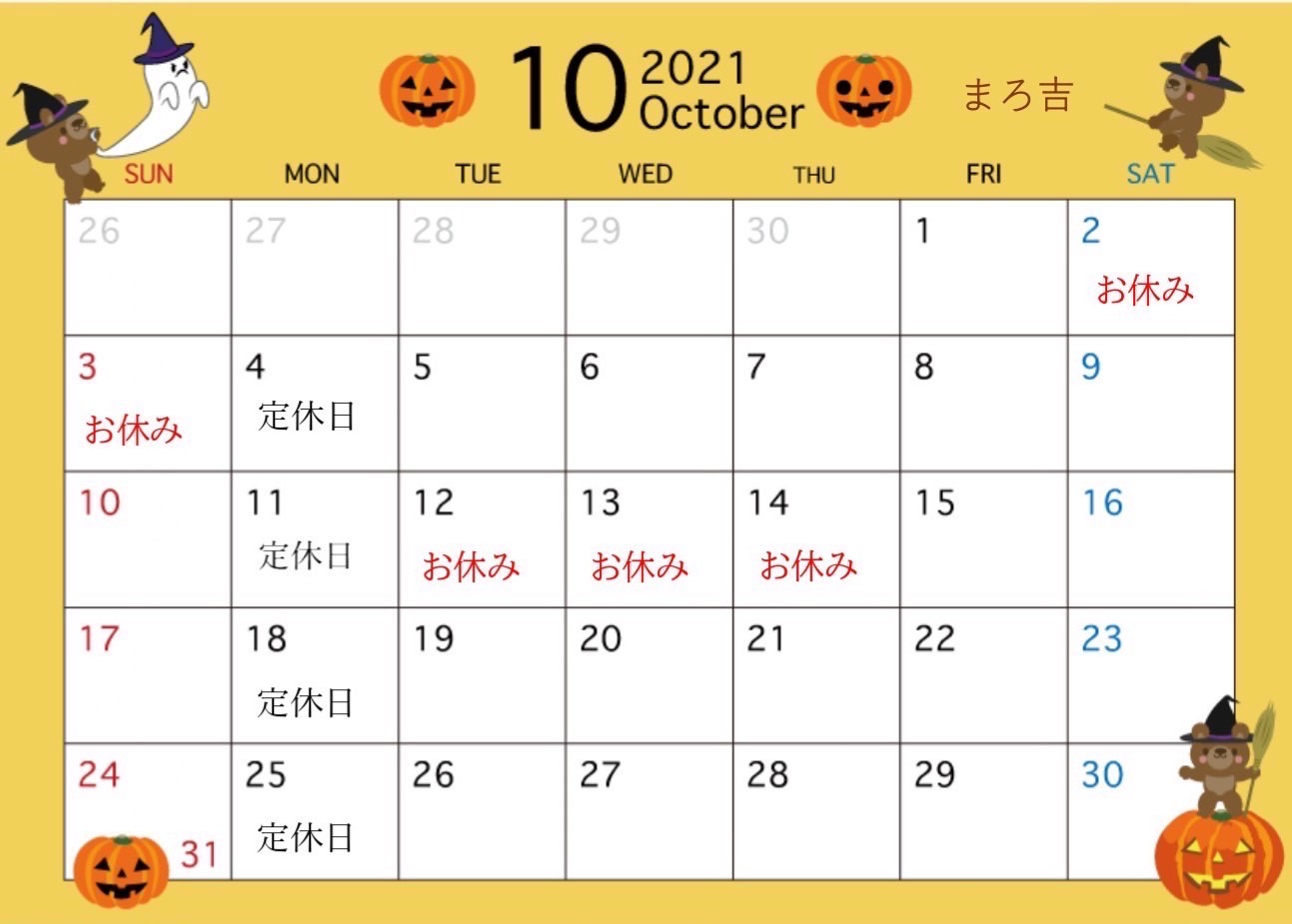 いつもまろ吉をご利用いただきありがとうございます。 10月の営業日カレンダーです。