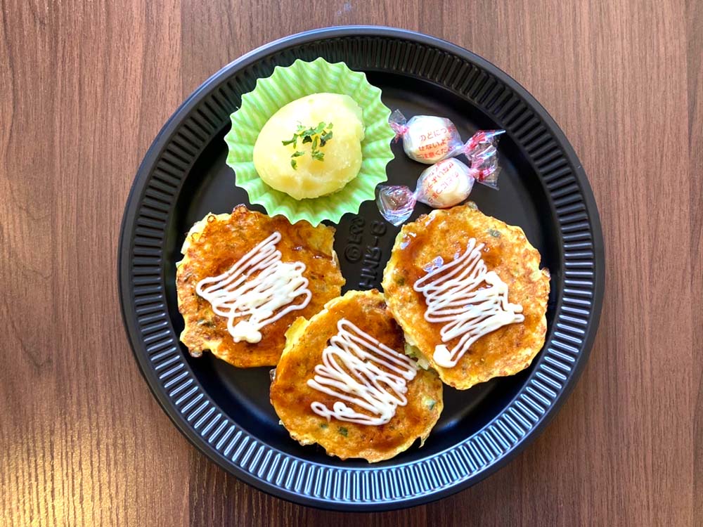 子供のごはんで悩んでるママ、パパのために一歳から食べられるお好み焼きを作りました! 道産の野菜と豚肉をたっぷり使用し、小麦アレルギーのある方でも食べられるようコーンフラワーで作りました。 マッシュポテトは道産きたあかりを使用し、オリゴ糖とバターで優しい甘さに仕上げています。 価格は450円です。