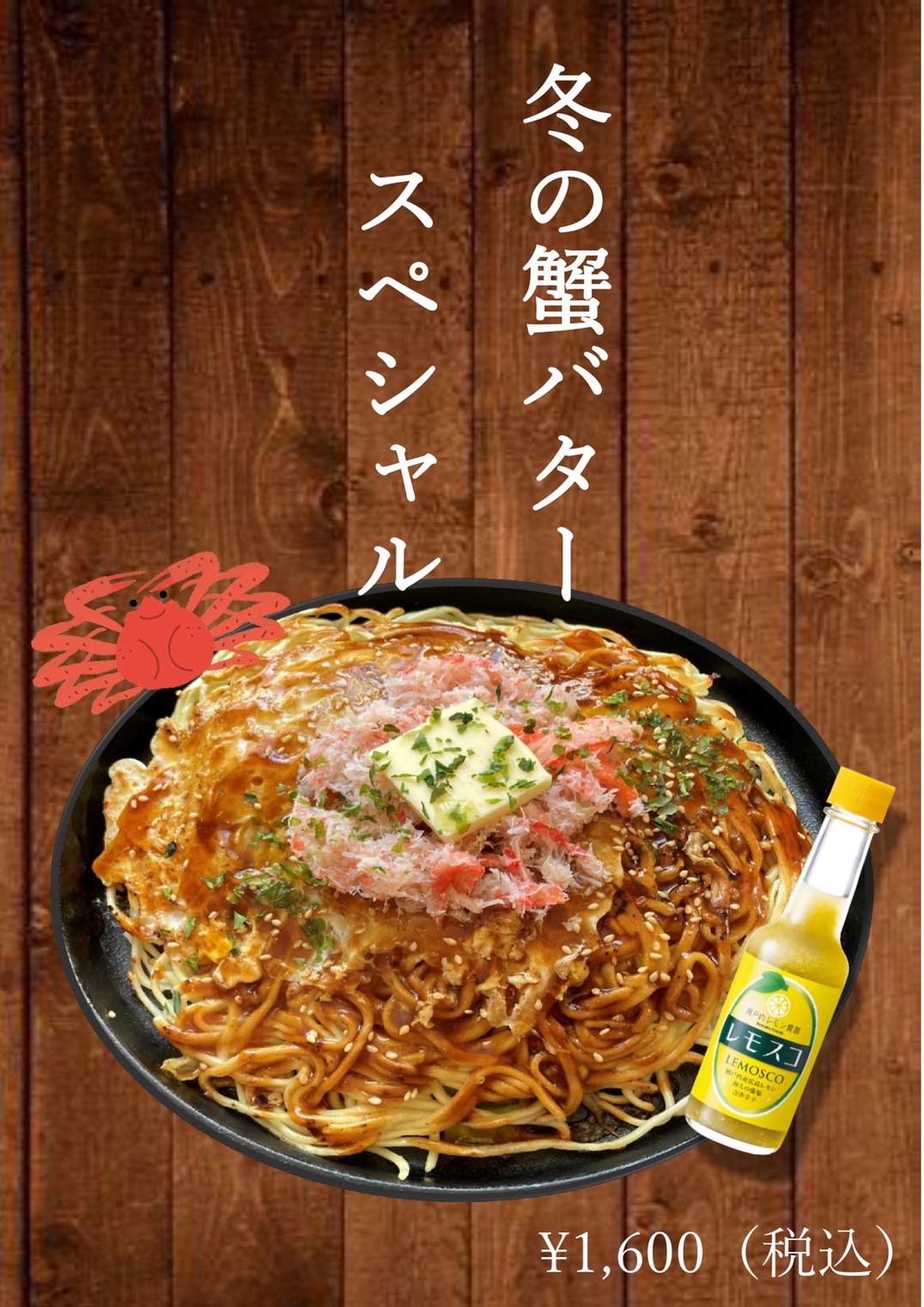 蟹のほぐし身、足肉、甲羅パウダーをふんだんに使い、お好み焼きの中にカニの存在感を際立たせました。 さらにバターの濃厚な味わいと、広島産「レモスコ」のさっぱりした風味でカニの美味しさを引き立てます。