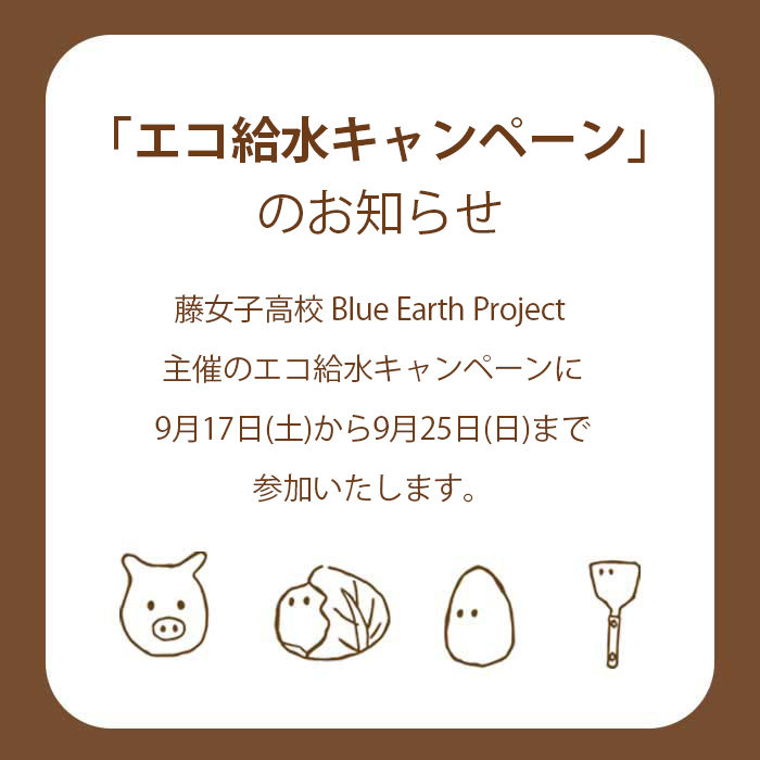 藤女子高校 Blue Earth Project 主催のエコ給水キャンペーンに9月17日(土)から9月25日(日)まで参加いたします。