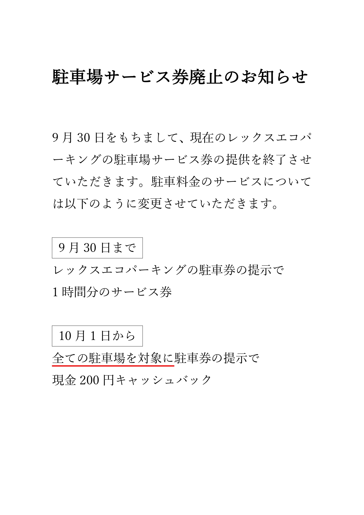 この度提携駐車場の値上げにより、9月30日を持ちまして現在のレックスエコーパーキングの駐車場サービス券の提供を終了させていただきます。