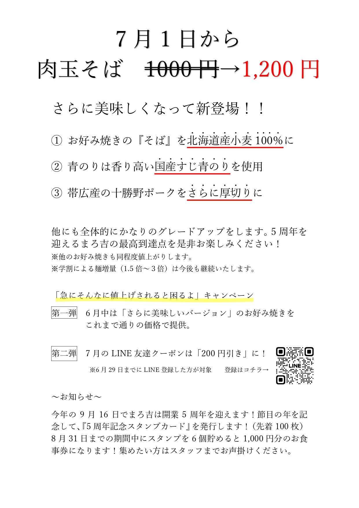 (道産子焼き、焼きそば、焼きうどん、一歳からのお好み焼きは価格据え置き)
