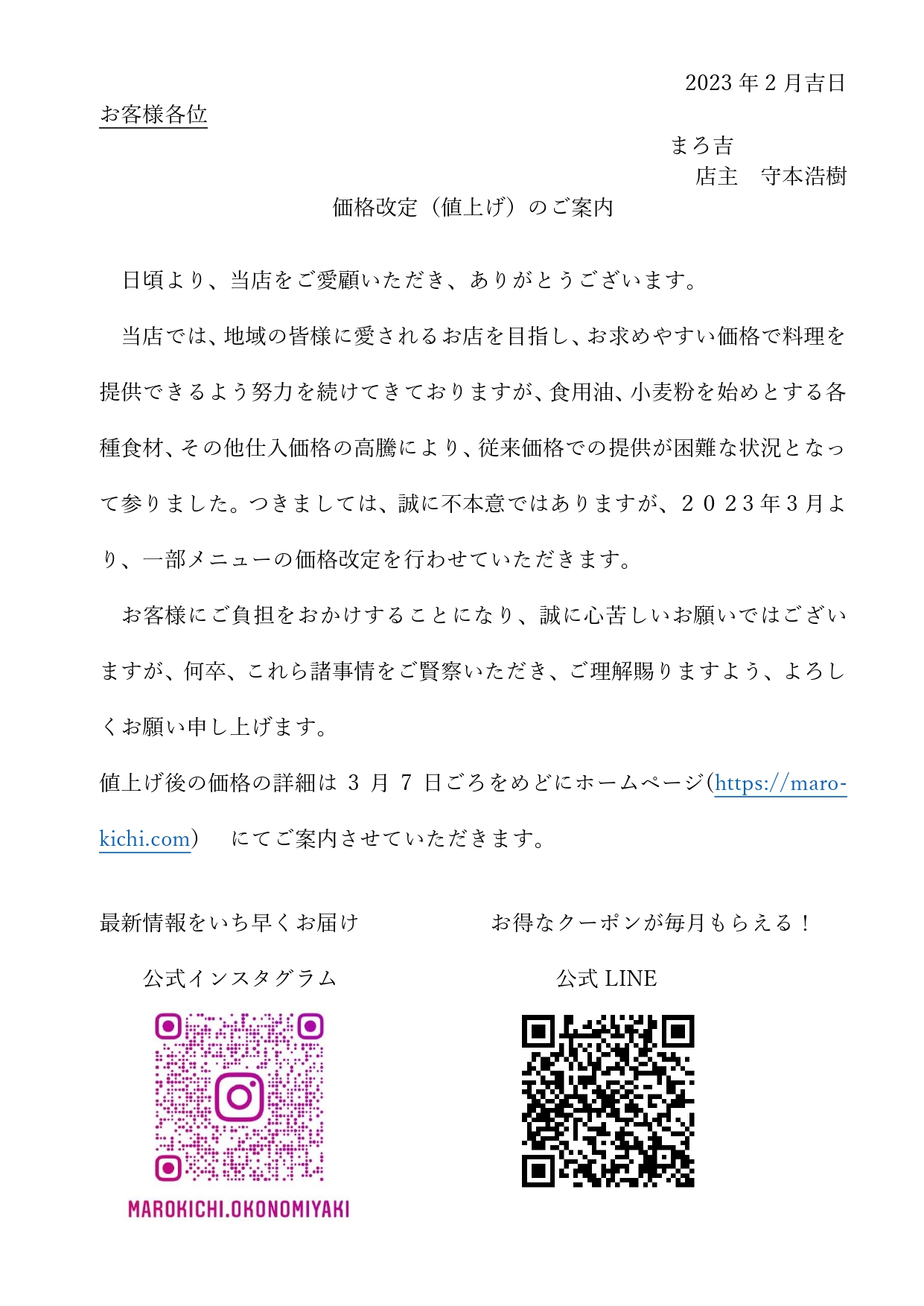 つきましては、誠に不本意ではありますが、2023年3月より一部メニューの価格改定を行わせていただきます。