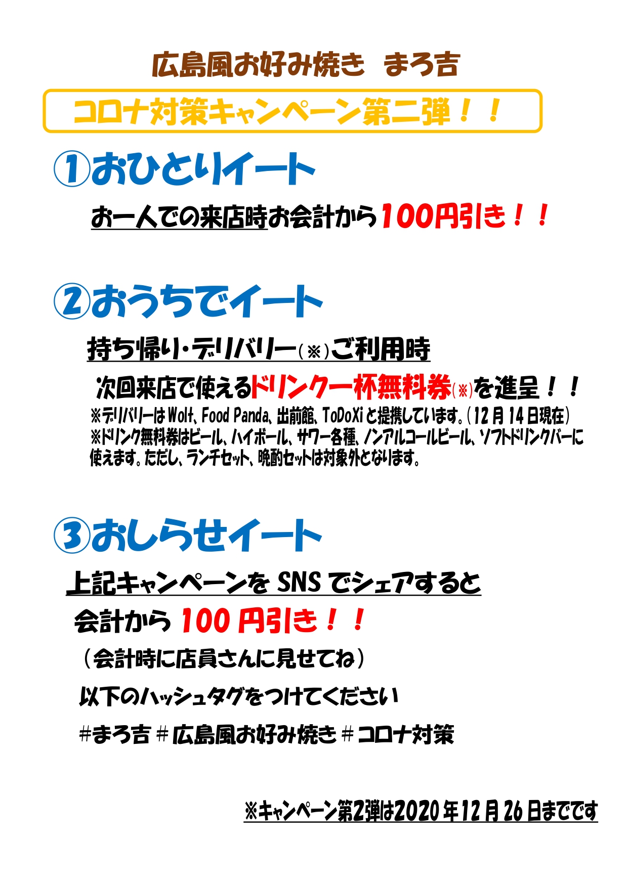 今回はお一人で食事される方、ご自宅で食事される方、さらにコロナ対策の取り組みを他の方々に広げる事に協力していただいた方に値引きやお得なクーポンを差し上げております。