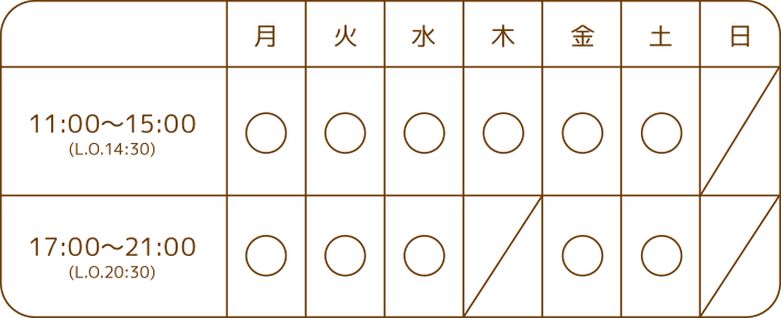 営業時間 11:00~15:00 (14:00 L.O)、 17:00〜21:00 (20:30 L.O)